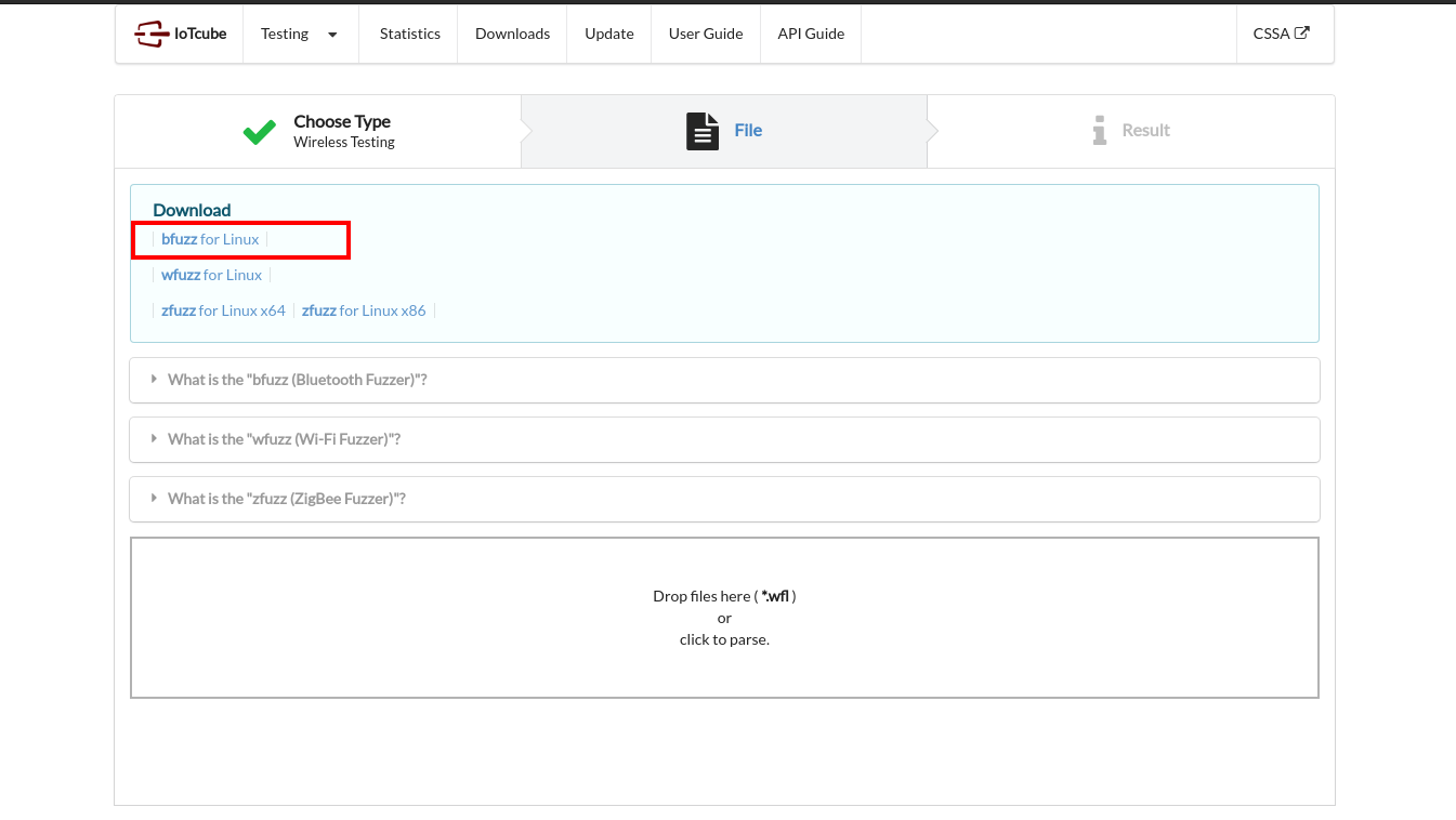 To begin bfuzz, click Blackbox Testing in the main page of IoTcube, then proceed by clicking Wireless Testing.