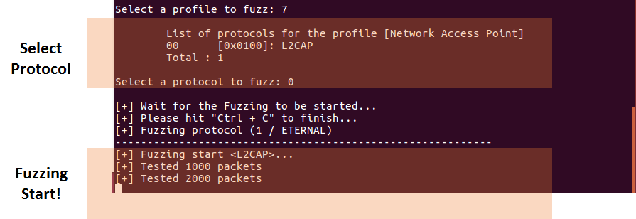 Select a protocol to launch fuzzing. Then it automatically starts! If you want to stop the fuzzing process, press Ctrl + C
