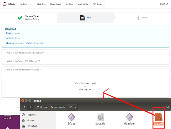 Find the log.wfl file created in the same directory as the fuzzing program and upload it to IoTcube.