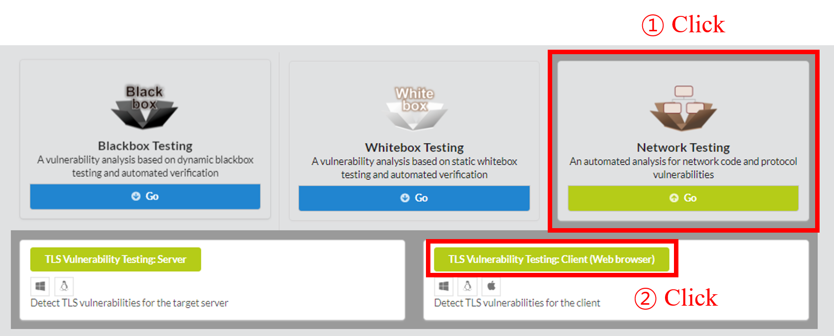 To begin BSCAN, click Network Testing in the main page of IoTcube, then proceed by clicking TLS Vulnerabilities Testing: Client (Web browser).