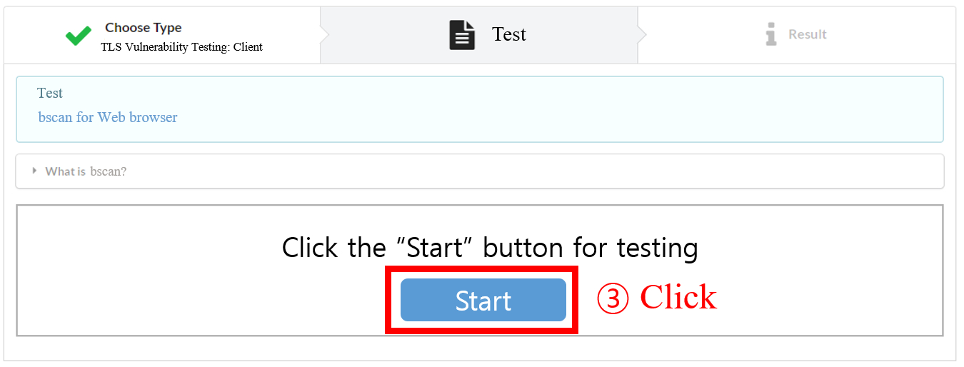 Browser Security sCanner with Automatic detectioN (BSCAN) is a tool for scanning TLS vulnerabilities in the client web browser, which is capable of detecting specific TLS vulnerabilities in web browser the client uses efficiently.