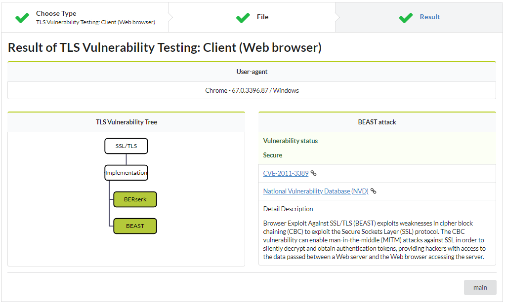 The result shows detected vulnerabilites in the client web browser and the descriptions of TLS vulnerabilities. It is visualized in tree architecture to effectively show the state of the web browser. User also can check more information about the vulnerability on the right screen.