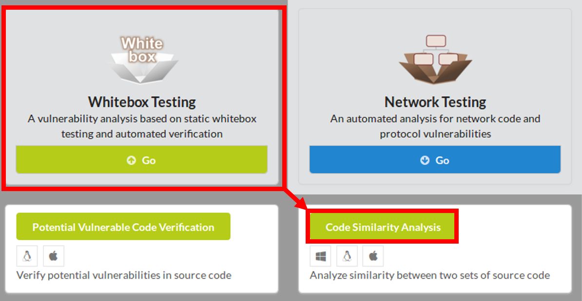 To begin Code Similarity Analysis, click Whitebox Testing in the main page of IoTcube, then proceed by clicking Code Similarity Analysis.