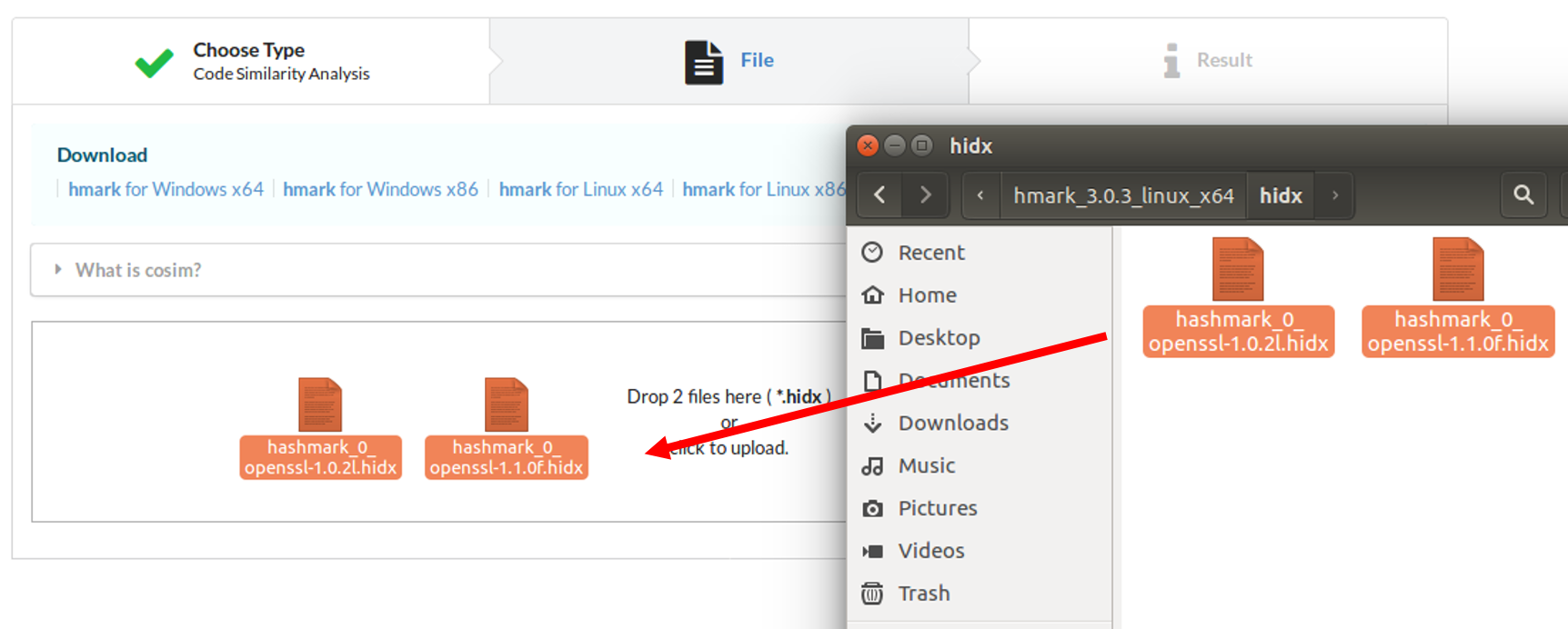 Upload the generated hash index files either by dragging & dropping the files into the upload box, or by selecting from a file dialog.