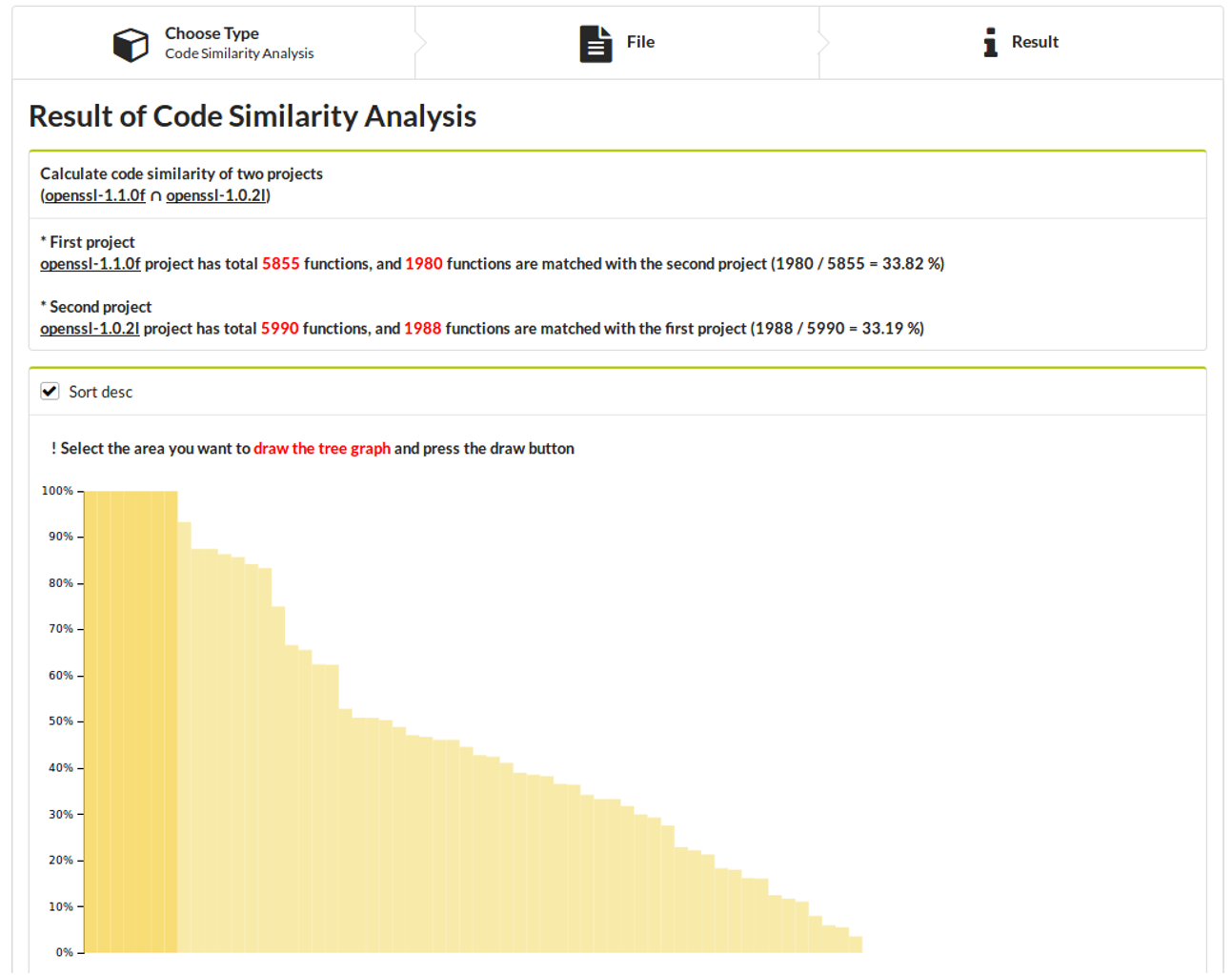 The number of total functions of two projects are shown, and also show the common functions between two projects. The bar graph shows how many functions in the first project match with the second project visually.