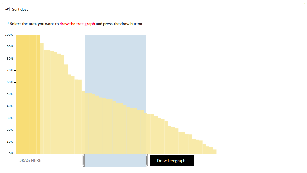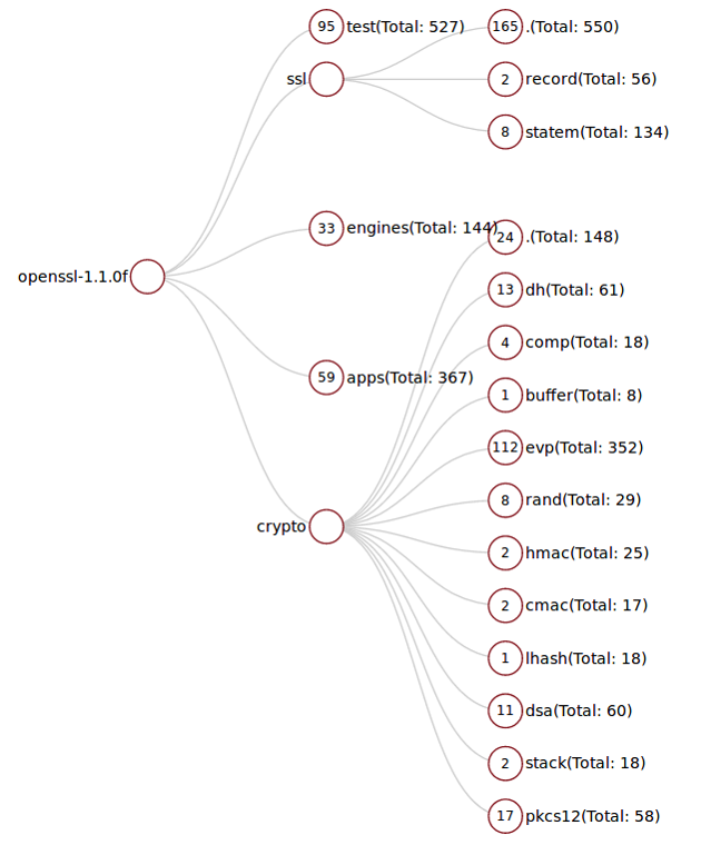Select the area of bar graph and click the Draw tree button, then the tree is shown. Each leaf node corresponds to a directory, and the numbers in the leaf nodes denote the number of matched functions in the directory.