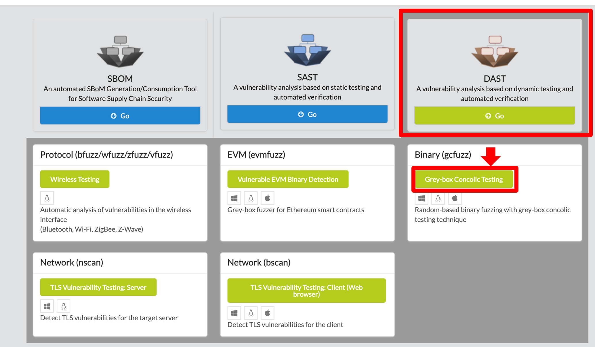 gcfuzz, click on DAST in the main page of IOTCUBE, then proceed by clicking Grey-box Concolic Testing button on Binary(gcfuzz)