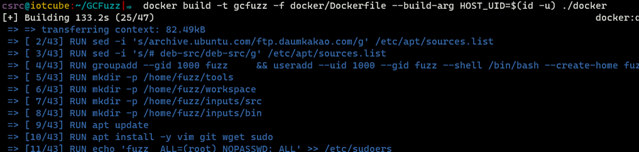 $ docker build -t gcfuzz -f docker/Dockerfile. ./docker** If Permission Error, Run `sudo usermod -aG docker $USER` and reconnect.