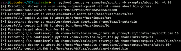 * The 'run.py' script operates as follows: 1. Create a container for testing. 2. Copy the binary and source code to the container. 3. Execute the fuzzing test. 4. (If the source code exists) Get Code coverage. 5. Copy the execution results. 6. Remove the testing container.