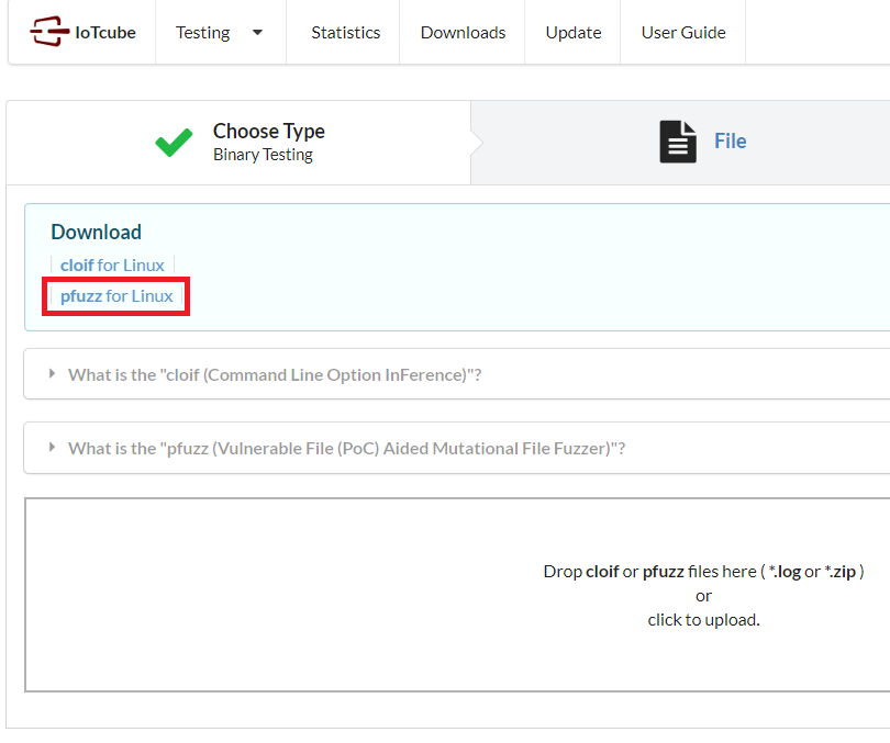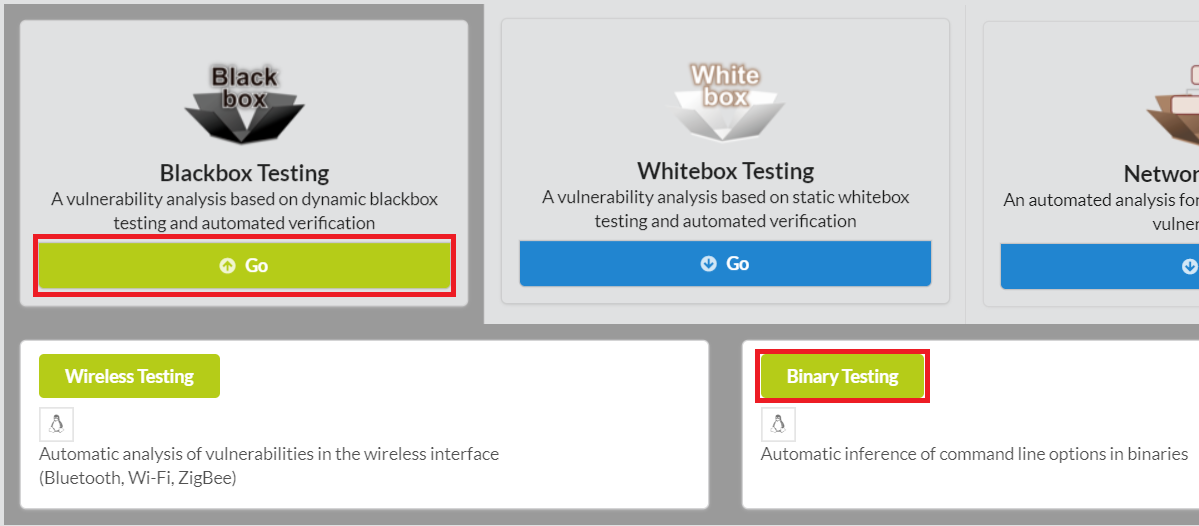 To begin pfuzz, click Blackbox Testing in the main page of IoTcube, then proceed by clicking Binary Testing.