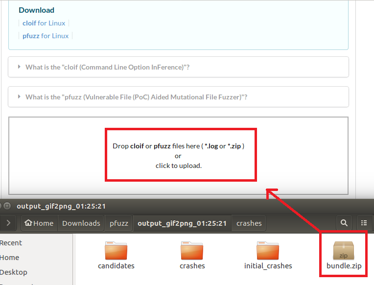 Find the bundle.zip file created in the output path (/pfuzz/output_[target_binary]/) and upload it to IoTcube!