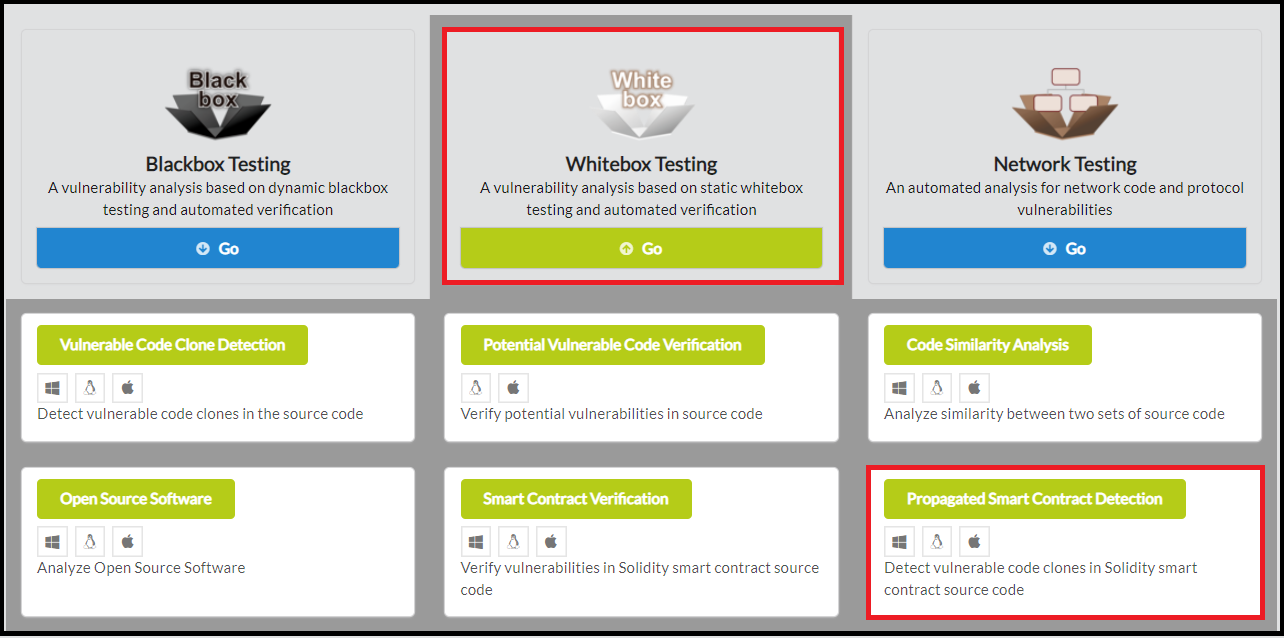 To start using prost, click Whitebox Testing in the main page of IoTcube, then proceed by clicking Propagated Smart Contract Detection.