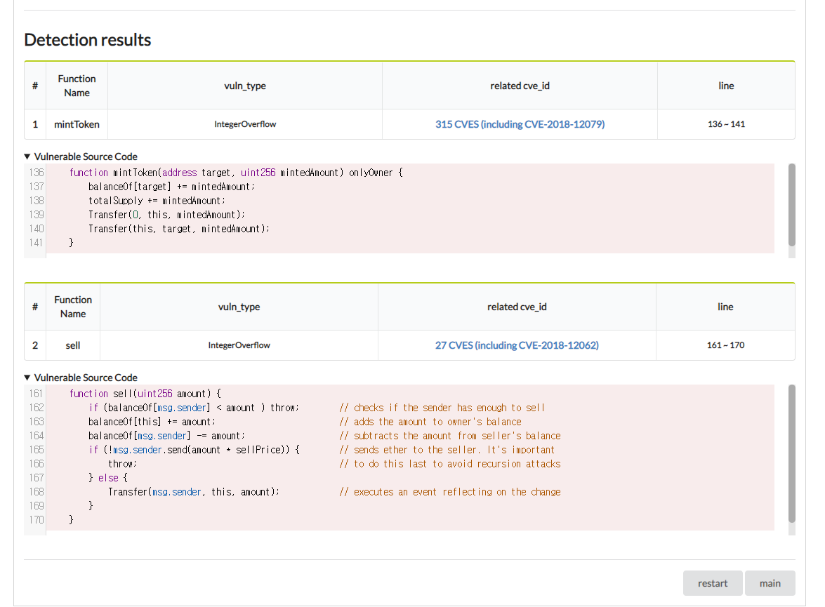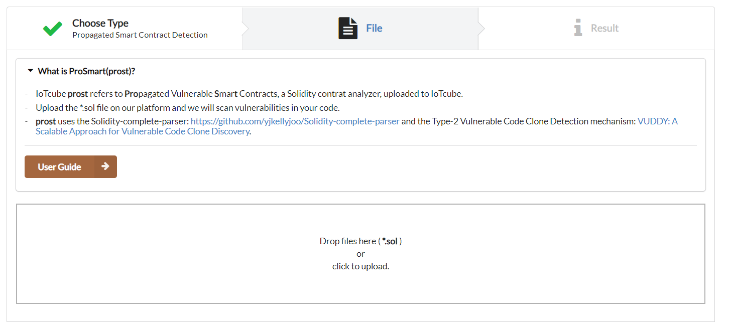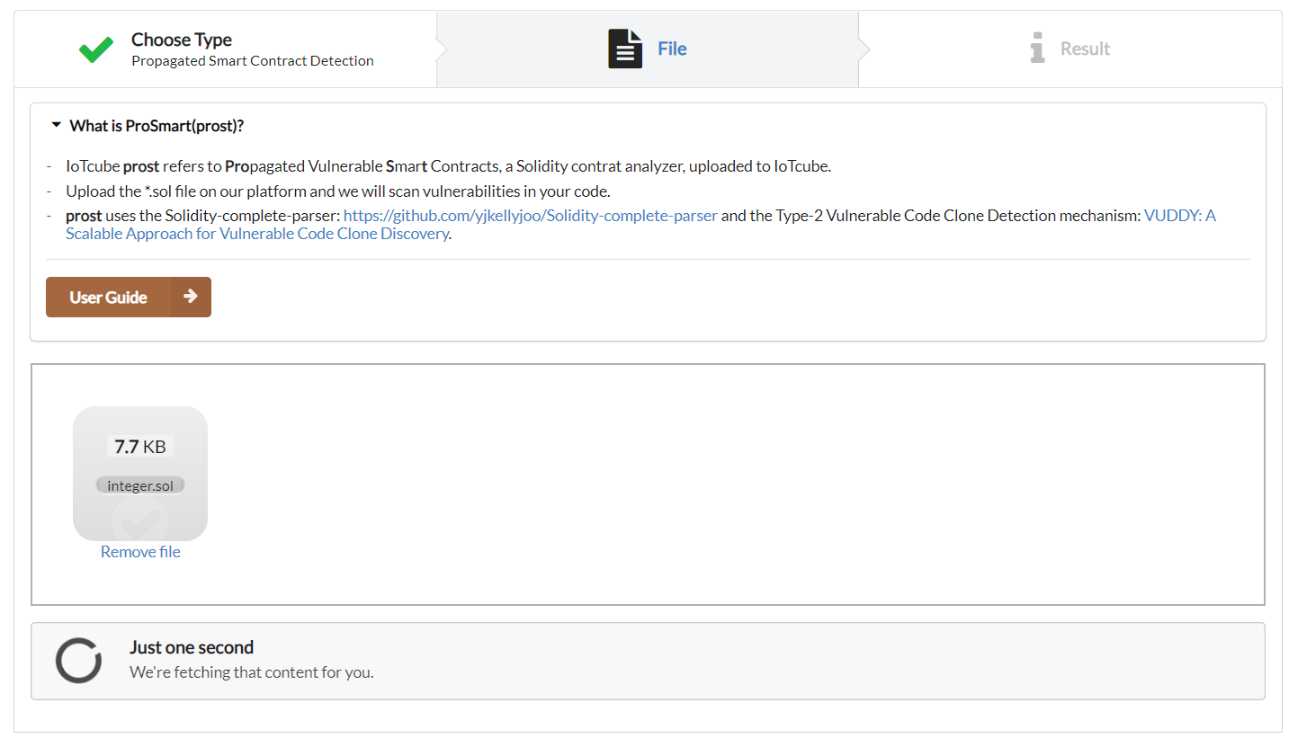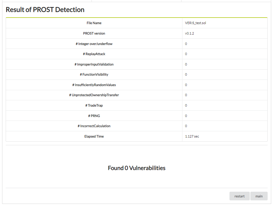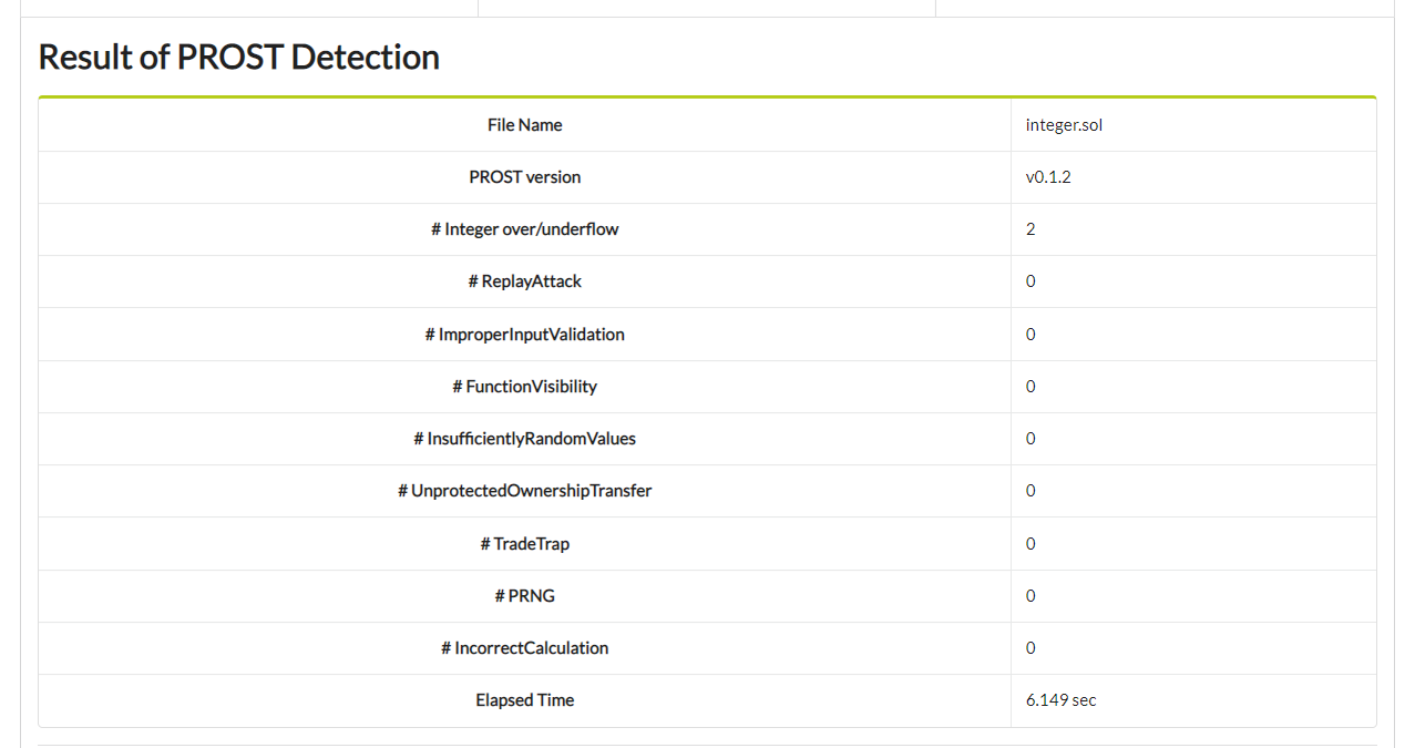 After uploading your *.sol file, it will be checked by prost and show you the result of detection.