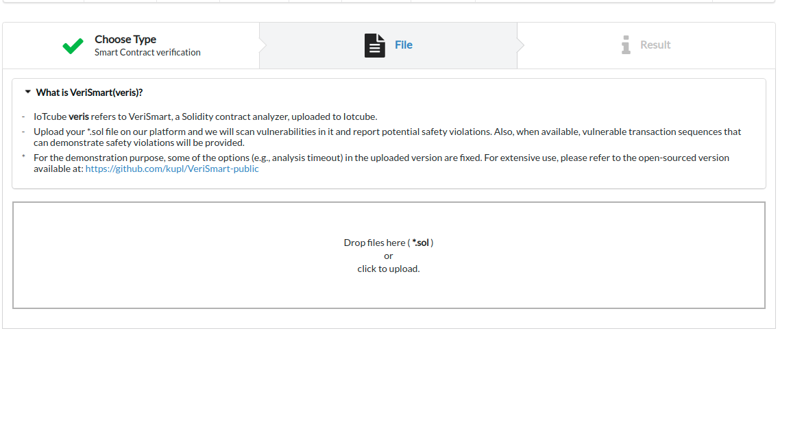 To start using veris(VeriSmart), click Whitebox Testing in the main page of IoTcube, then proceed by clicking Smart Contract Verification.