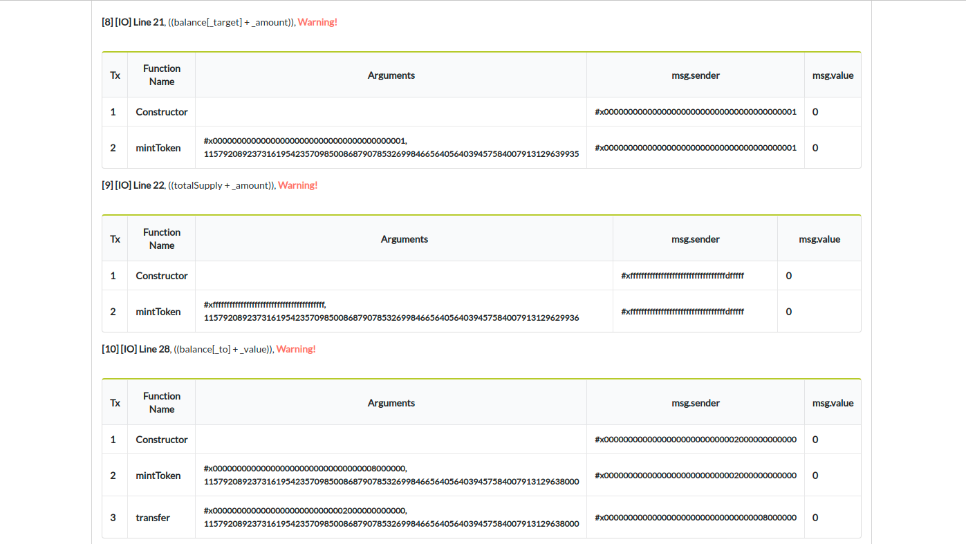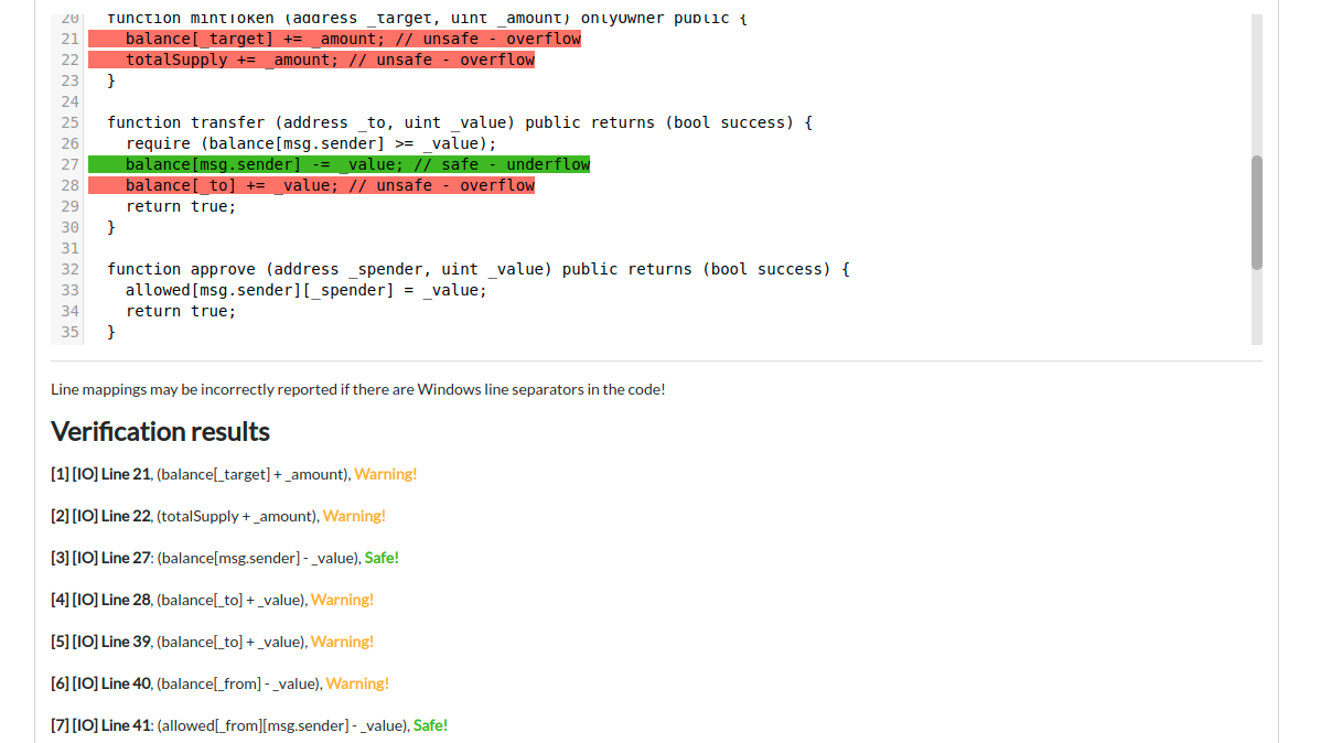 2.) Your smart contract code with vulnerable lines being highlighted by green(safe), orange(vulnerable) or red(vulnerable with vulnerable transaction sequence) and warnings.