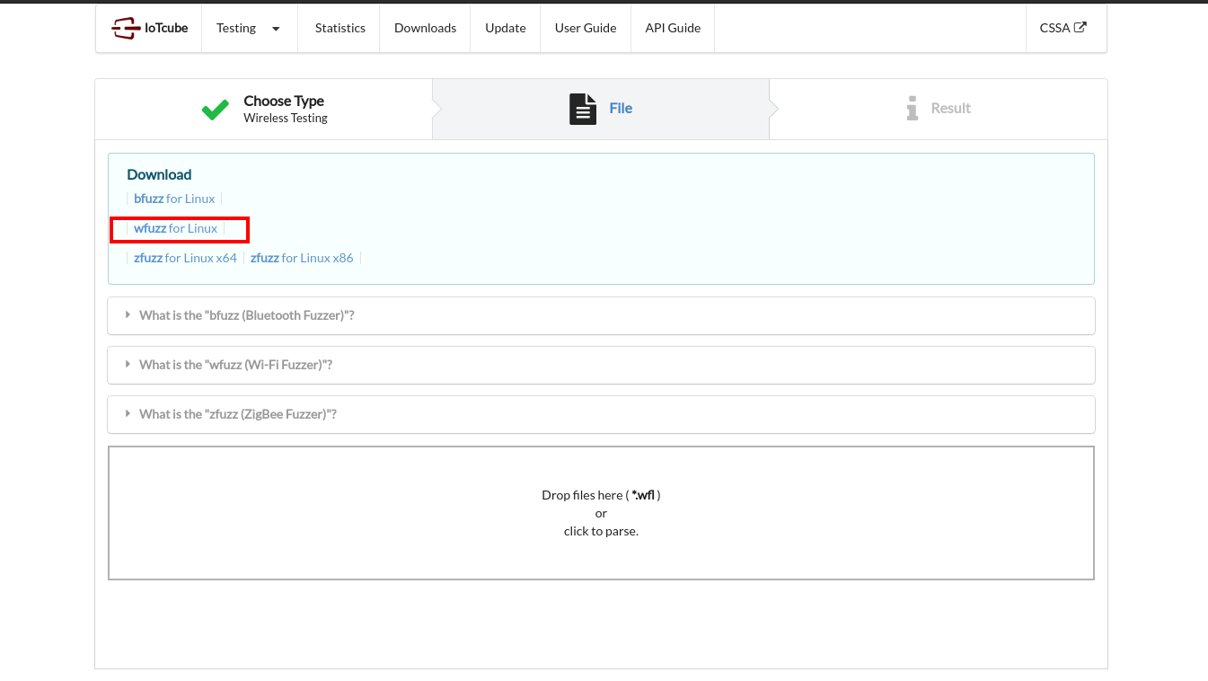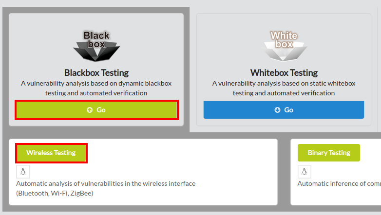 To begin wfuzz, click Blackbox Testing on the main page of IoTcube, and proceed by clicking Wireless Testing.