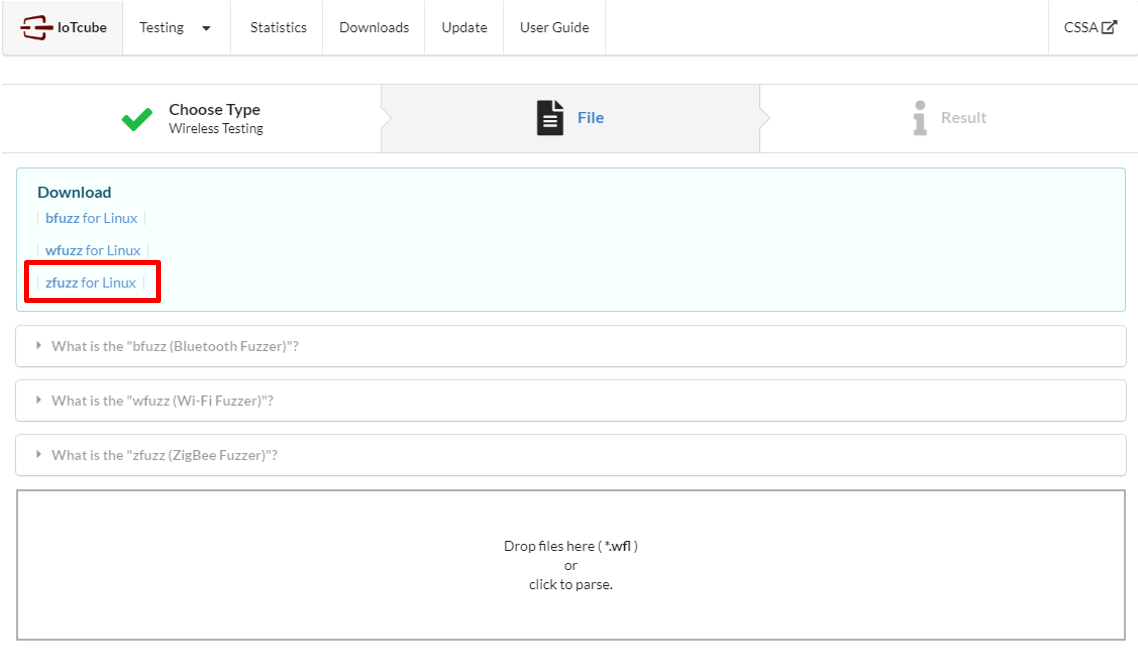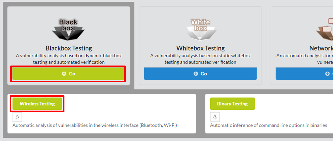 To begin zfuzz, click Blackbox Testing in the main page of IoTcube, then proceed by clicking Wireless Testing.