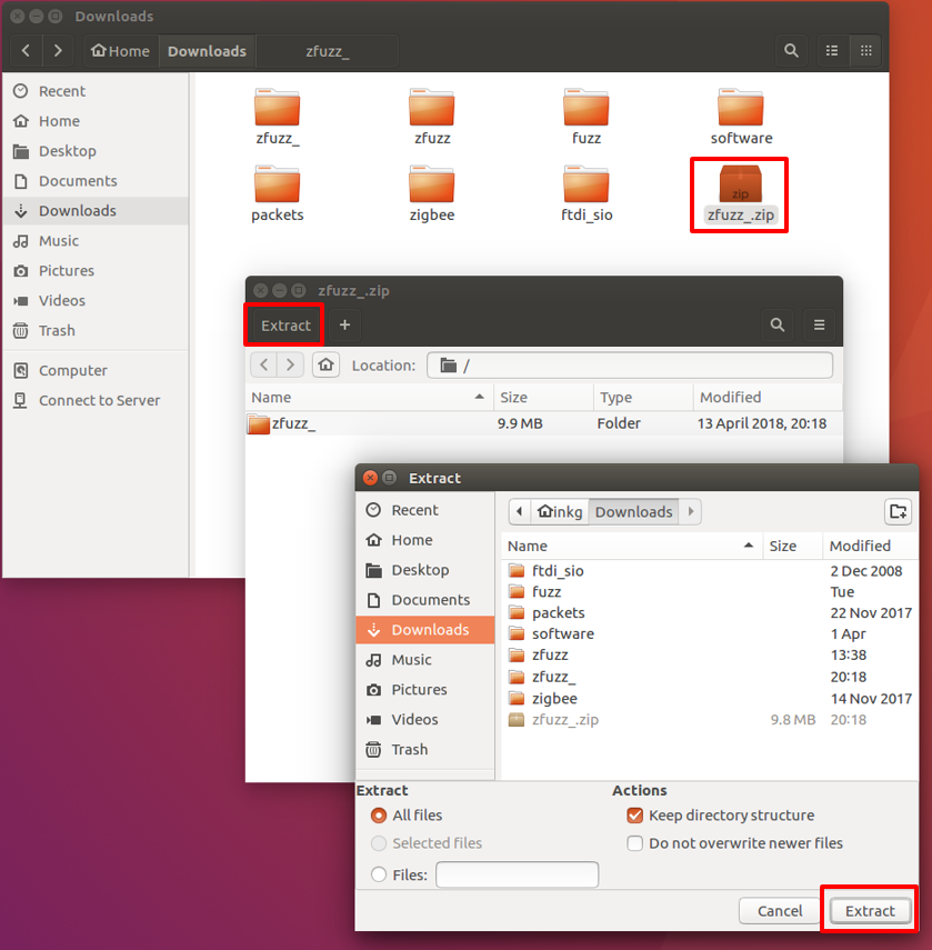 Please unzip the package "zfuzz.zip" downloaded in the previous step with your own unarchiving tool.