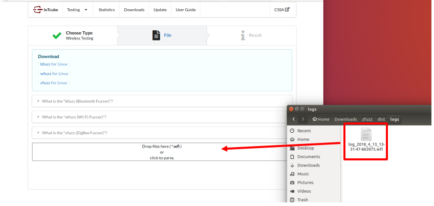 Find the log_{data}.wfl file created in the same directory as the fuzzing program and upload it to IoTcube.